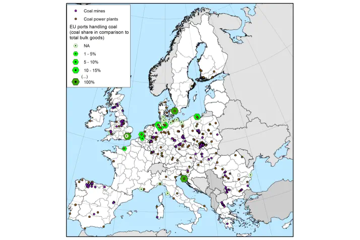 Location of coal terminals in EU and share of coal transported/handled by the port in comparison to bulk goods, EU coal regions: opportunities and challenges ahead